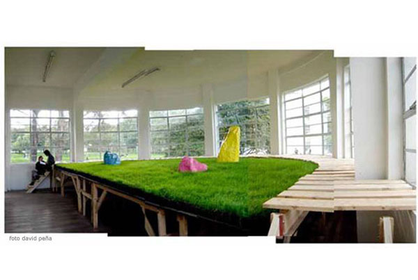 Instalación con plataforma en madera, cesped natural y piezas en fibra de vidrio y resina de poliester.